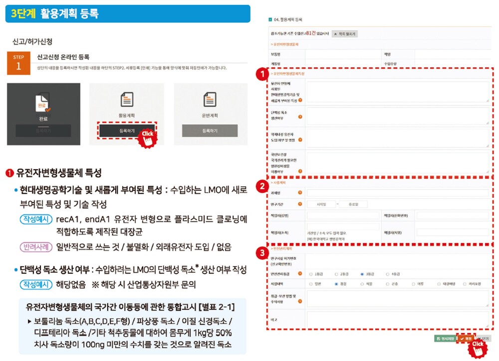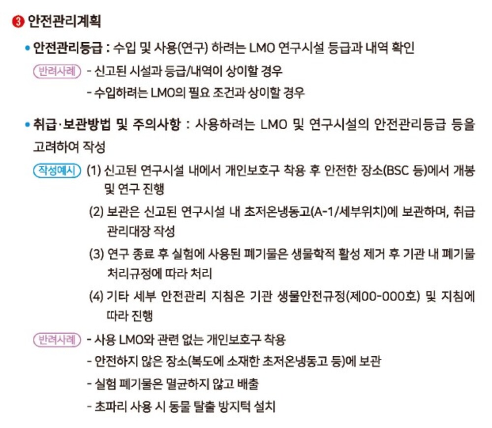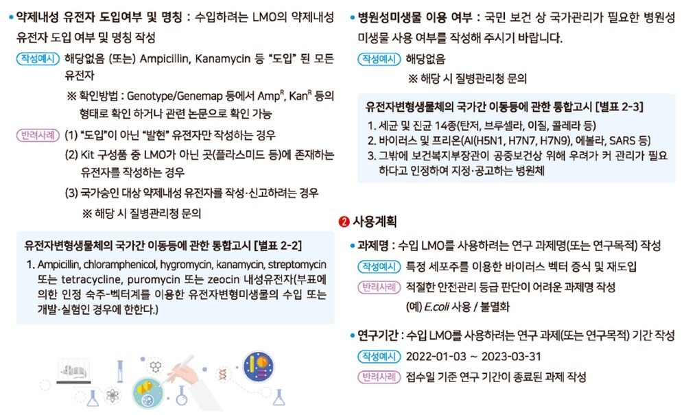 - 시험·연구용으로 사용하거나 박람회 또는 전시회에 출품하기 위하여 유전자변형생물체를 수입하고자 하는 자가 과학기술정보통신부장관에게 신고하는 민원